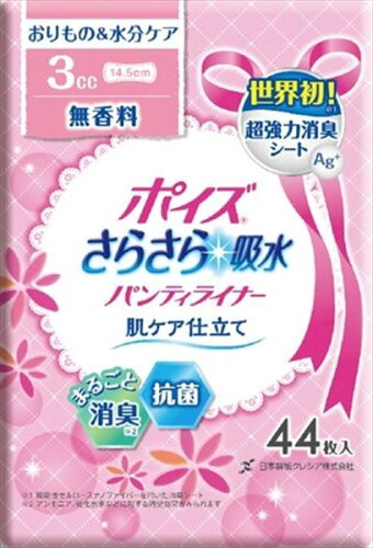 ポイズさらさら吸水パンティライナー 無香料 44枚 【 日本製紙クレシア 】 【 生理用品 】●世界初!機能性セルロースナノファイバーを用いた抗菌効果のある超強力消臭シートで気になるニオイも安心●スピード吸収ポリマーでさらっとおりもの&水分ケア●お肌にやさしい素肌と同じ弱酸性のやわらかシート●ムレにくい全面通気性●かわいい3種のデザインエンボス●無香料●長さ:14.5cm●吸収量の目安:3cc【単品サイズ】103×140×68(mm)【容量】44枚リニューアルに伴い、パッケージ・内容等予告なく変更する場合がございます。