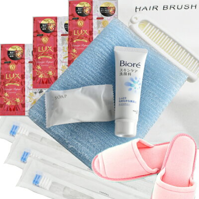入院セット 【 ビオレスキンケア洗顔料30g ラックス ルミニーク シャンプー&コンディショナー ・ スリッパ ・ 使い捨てハブラシ 3本 ・ ホテルソープ ・ ボディタオル・ 折り畳みヘアブラシ 】