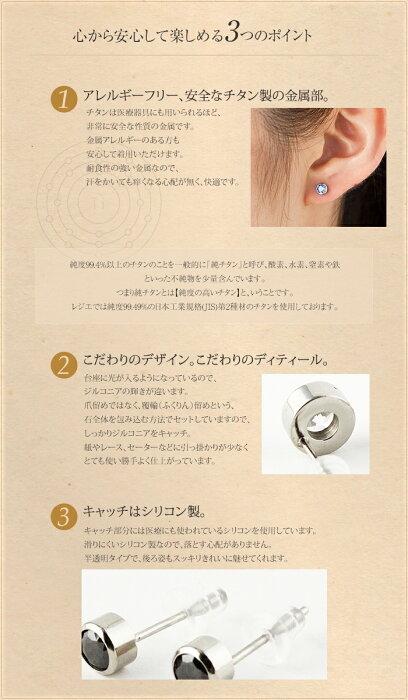 材 質 金属部分:純チタン(99.4%以上)石部分:ジルコニアキャッチ:シリコンゴム カラー クリア・ブラック・レモン・ピンク・アクアマリン・ライトサファイアブルー サイズ 重量 ジルコニア φ4.0mm ピアスの直径 約5.0mm ピアスの厚み 約3.0mm ポスト 径 0.8mm ポスト 長さ 約13.0mm 重量 約0.5g(片方) 備 考 ※1点1点、色合い・形・サイズなどが若干異なる場合がございます。