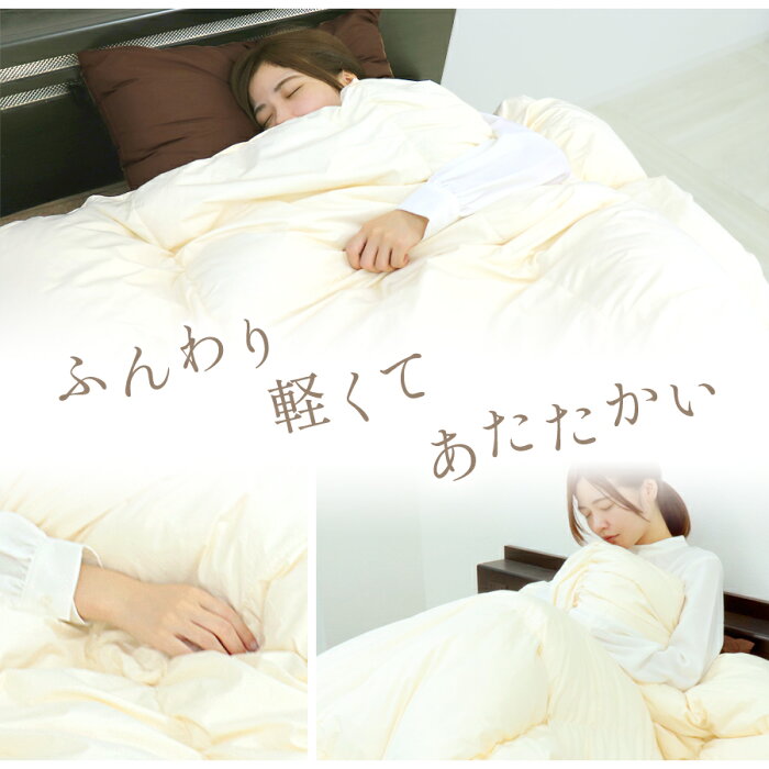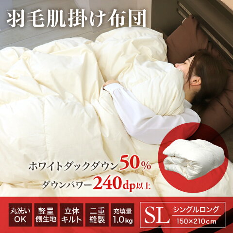 ご家庭でのお洗濯OK! 商 品 詳 細 内容 羽毛布団 ×1 カラー アイボリー サイズ (約)150×210cm(シングルロングサイズ) 総重量 (約)1.7kg 詰め物重量 (約)1.0kg ダウンパワー (約)DP240/cm3以上 素材 ・詰め物:ホワイトダックダウン50%、スモールフェザー50% ・側生地:ポリエステル85%、綿15% その他 ・4×5マス立体キルト加工 ・ダウンプルーフ加工 ・8ヶ所ループ付き ・丸洗い可能 保証期間 7日間 ※商品到着後7日以内の初期不良・破損のみご対応させていただきます。