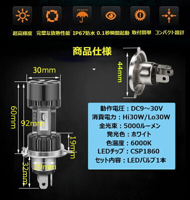 【商品仕様】 バイク用LEDヘッドライト 1個セット ソケット形状:H4/HS1(HiLo)/BA20D(HiLo)選択可 起動電圧:9V-30V(直流専用) LED消費電力:Hi:30W/Lo:30W 明るさ:5000LM(ホワイト発光)/3200LM(イェロー発光) 色温度:6000K ホワイト/3000K イェロー選択可能 LED寿命:30000時間以上 本体色:ブラック 重量:140g/set 防水等級:IP67 保証期間:1年間 色温、型式、サイズを必ずご確認下さい。