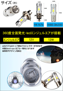 アイテム情報 商品仕様 ソケット:H4/H4BS(BA20D) Hi/Lo パワー:12W 動作電圧:DC9-85V チップ:COBチップ 明るさ: ハイビーム:1200LM ロービーム:800LM 発光色:ホワイト+ブルー(エンジェルエア) 商品ポイント 1.高品質COBチップ採用、長寿命・均一発光・高輝度・高出力・高効率!バイク用新型LEDヘッドライト! 2.特製のアルミ合金をランプの全体に使用!熱伝道性と耐熱性が通常の金属材質より倍になります! 3.スマートチップを採用、バルブに提供される電流と電圧を安定して正確にコントロールします。